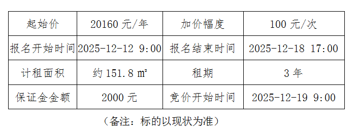 1、自由报价阶段从2025年12月19日9点00分开始,自由报价时长为120分钟。自由报价结束之后,以自由报价阶段的最高报价作为限时报价的底价进入限时报价阶段。限时报价周期为900秒,直至无人报价,则竞价结束。本项目原承租人具有优先承租权,可以根据个人意愿决定是否行使优先权。具体操作方法见平台主页“通知公告-电子竞价平台相关操作流程”。