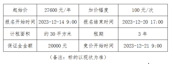 现定于2023年12月21日(星期四)上午9时在安溪县供销合作社联合社—产权交易网络竞价系统(网址:http://www.axcoop.net的竞价平台端口)与“安溪县供销社资产管理中心”微信公众号的竞价平台端口,公开竞价出租安溪县湖头镇新湖路50-1号店面,欢迎符合条件的意向承租人前来参与竞价。现将有关情况公告如下: